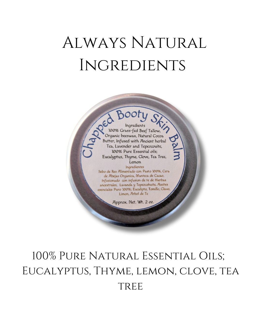 Ancient Releaf Chapped Booty Skin Balm is crafted to aide with calming, soothing, and nourishing chapped and irritated skin. This unique balm is enriched with Ancient Herbal tea that includes avocado leaves, guanabana leaves, thyme, sage, and tulsi, along with tepezcohuite. It boasts a combination of premium oils and butters such as 100% grass-fed beef tallow, organic beeswax, natural cocoa butter, and 100% pure essential oils to enhance its effectiveness. Perfect for treating diaper rashes and various skin irritations, this balm ensures your skin feels soothed, nourished, and hydrated. Embrace the power of natural skin care! ******Storage Tips: All-natural ingredients such as oils and butters are best preserved when stored in a cool, dark environment, such as a bathroom cabinet or countertop. It is essential to avoid high temperatures and direct sunlight to maintain their effectiveness. ******Ingredients: 100% Grass-fed Beef Tallow, Organic Beeswax, Natural Cocoa Butter, Infused Ancient Herbal Tea and Tepezcohuite, 100% pure natural essential oils; Eucalyptus, Thyme, Clove, Tea Tree, Lemon