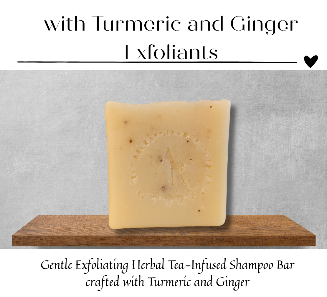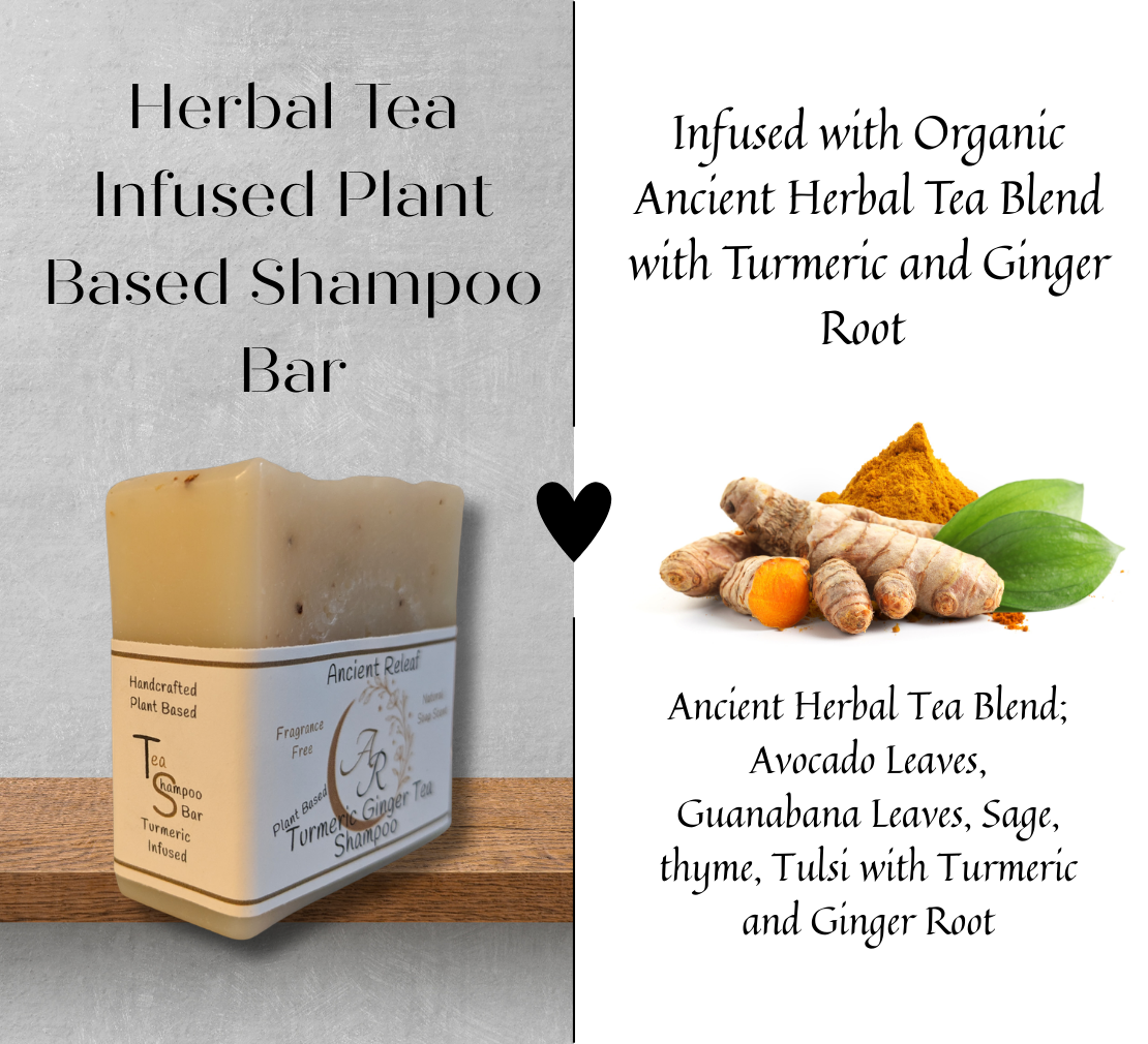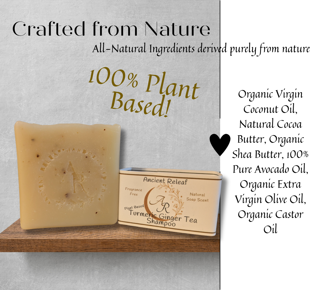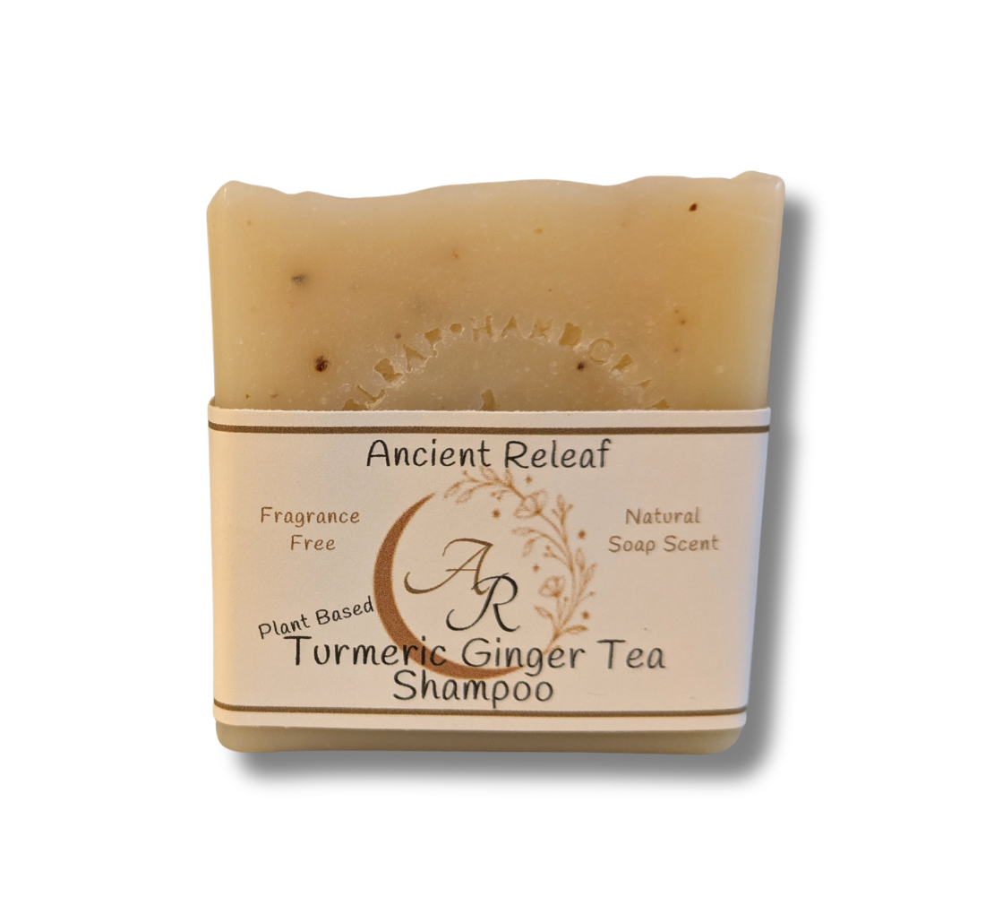 The Ancient Relief Turmeric Ginger Shampoo Tea Soap Bar offers a refreshing and exfoliating experience, crafted to naturally nourish and cleanse your hair. It effectively addresses dry, flaky scalp concerns while promoting natural hair strength. * This shampoo bar is crafted solely from natural oils and butters, and may lead to buildup in certain hair types, particularly for those new to using shampoo bars. It is advisable to follow up with an apple cider vinegar rinse after washing your hair. Apple cider vinegar gives a natural aid for hair, promoting strength and softness while helping to combat brittleness naturally. To create an apple cider vinegar rinse at home: For long hair: Mix 16 oz. of water with 2-4 tablespoons of ACV. For short hair: Combine 8 oz. of water with 1-2 tablespoons of ACV. You can also add 10 drops of your favorite essential oil; lavender, rosemary, cedarwood, and black pepper are recommended options. 5oz Soap Bar. Ingredients: Saponified oils; Organic virgin coconut oil, 100% pure avocado oil, natural castor oil, natural cocoa butter, organic shea butter, organic extra virgin olive oil, turmeric, ginger, ancient herbal tea with turmeric and ginger.