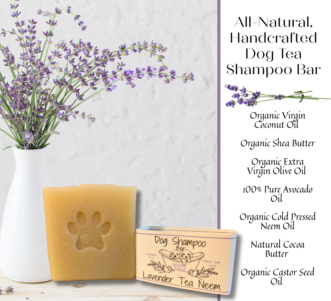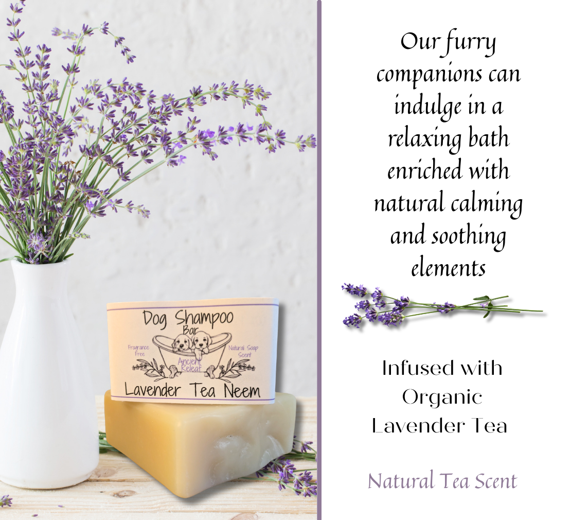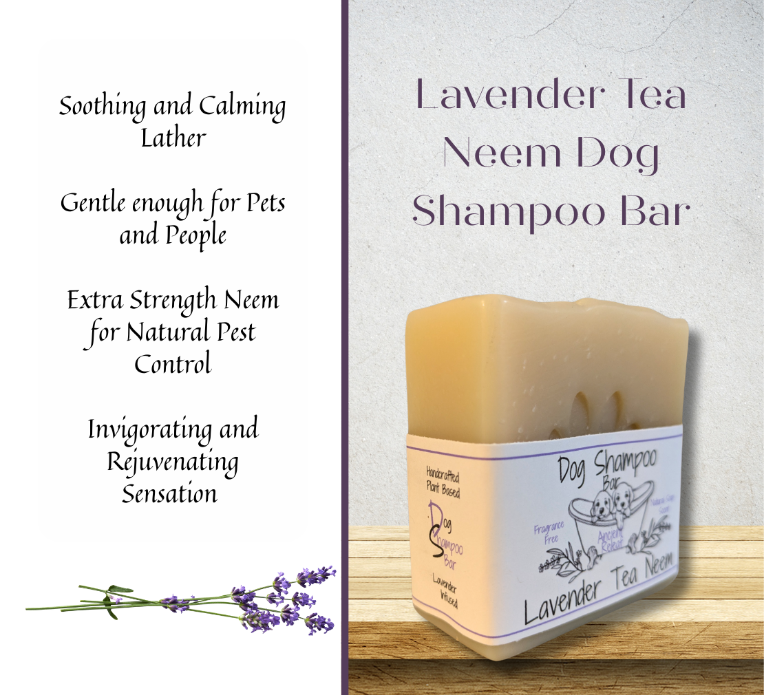 Lavender Tea Neem Dog Shampoo Bar is meticulously crafted from entirely natural ingredients, making it a 100% plant-based product. This shampoo bar is free from synthetic fragrances, offering a gentle, natural tea and neem scent. Enriched with lavender tea, it provides a calming and soothing experience during bath time. The formulation includes high-quality oils, notably cold-pressed neem oil, known for its natural aroma that effectively helps deter ticks and fleas. This pet shampoo bar generates a rich lather and is gentle enough for our furry companions and still safe for human use. ***Ingredients: Saponified Oils; 100% Pure Avocado Oil, Organic Virgin Coconut Oil, Organic Cold Pressed Neem Oil, Organic Shea Butter, Natural Cocoa Butter, Natural Castor seed Oil, Organic Extra Virgin Olive Oil, Organic Lavender Tea ***Approx. 5oz. Soap Bar*** ***All-Natural Cold Processed Soap Cured for 4-6 weeks before packaging.***