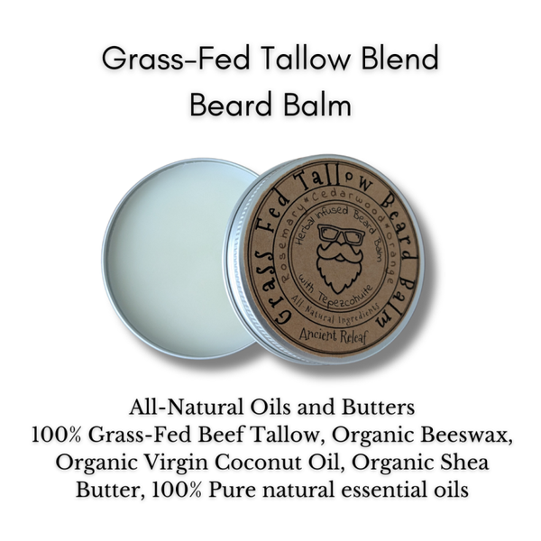 Ancient Releaf Beard Balm is crafted from all-natural ingredients designed to impart a soft, nourished, and revitalized feel to mustaches and beards. Infused with a blend of ancient herbal teas, including avocado leaves, guanabana leaves, thyme, sage, tulsi and Tepezcohuite, this balm is further enhanced with premium oils such as 100% grass-fed beef tallow, organic virgin coconut oil, organic beeswax, and organic shea butter. Together, these components maximize the nourishing benefits for your beard. Experience the difference that all-natural ingredients can make. ****Storage Tips: All-natural ingredients such as oils and butters are best preserved when stored in a cool, dark environment, such as a bathroom cabinet or countertop. It is essential to avoid high temperatures and direct sunlight to maintain their effectiveness. ****Ingredients: 100% Grass-Fed Beef Tallow, Organic Virgin Coconut Oil, Organic Beeswax, Organic Shea Butter, Ancient Herbal Tea with tepezcohuite, 100% Pure Natural Essential Oils; Rosemary, Cedarwood, Orange, PinkPepper, Basil