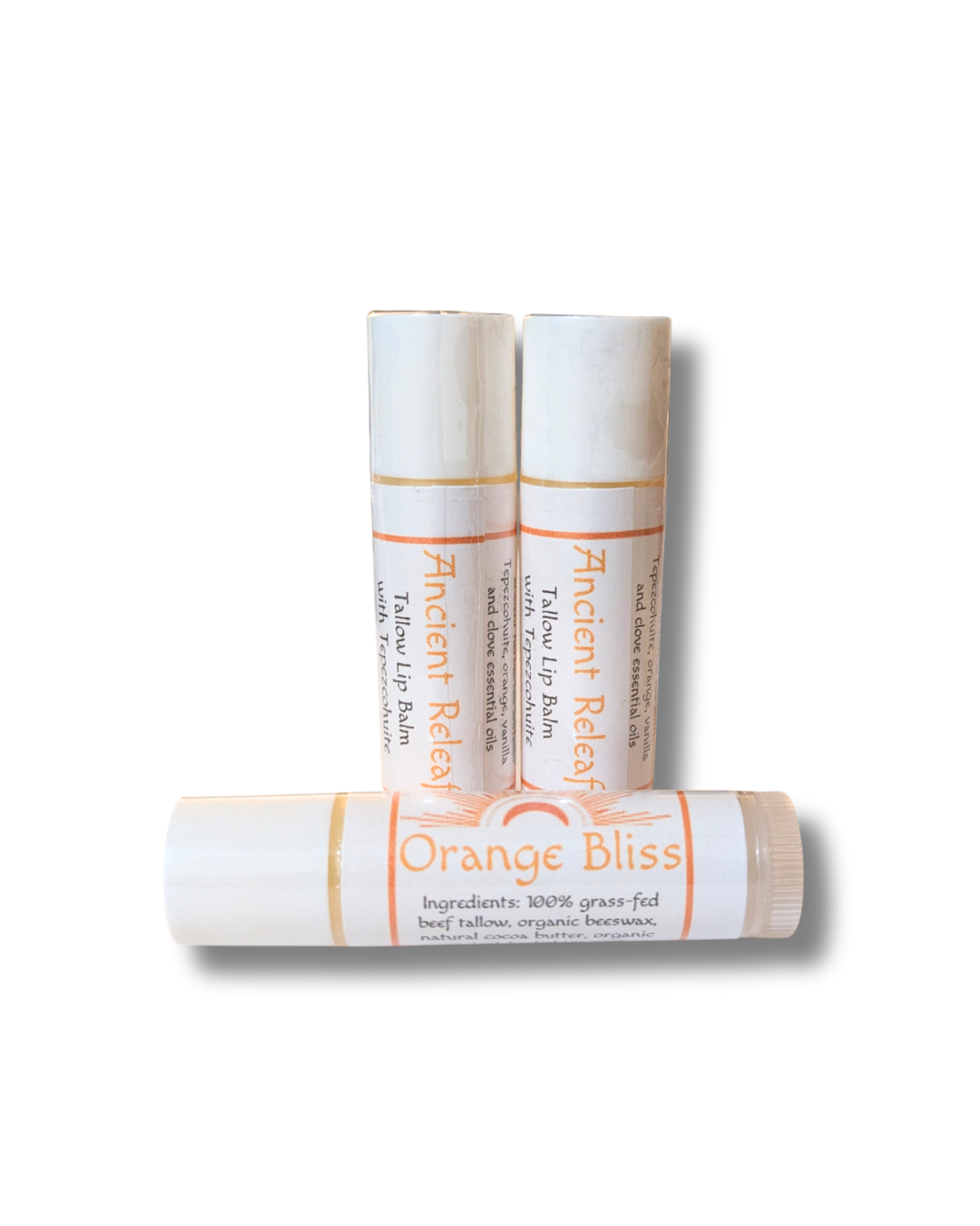 Ancient Releaf Tallow Lip Balm is enriched with a unique blend of ancient herbal teas, including Tepezcohuite. This soothing lip balm offers nourishing and soothing feel for cracked and chapped lips. Crafted from all-natural ingredients, using this lip balm can leave lips feeling soft, moisturized, and rejuvenated. ****The Orange Bliss 3 pack features three delightful lip balms.**** ****Orange Bliss Lip Balm Ingredients**** 100% Grass-fed beef Tallow, Natural Cocoa Butter, Organic Beeswax, 100% Natural Orange, Vanilla and Clove essential Oil.