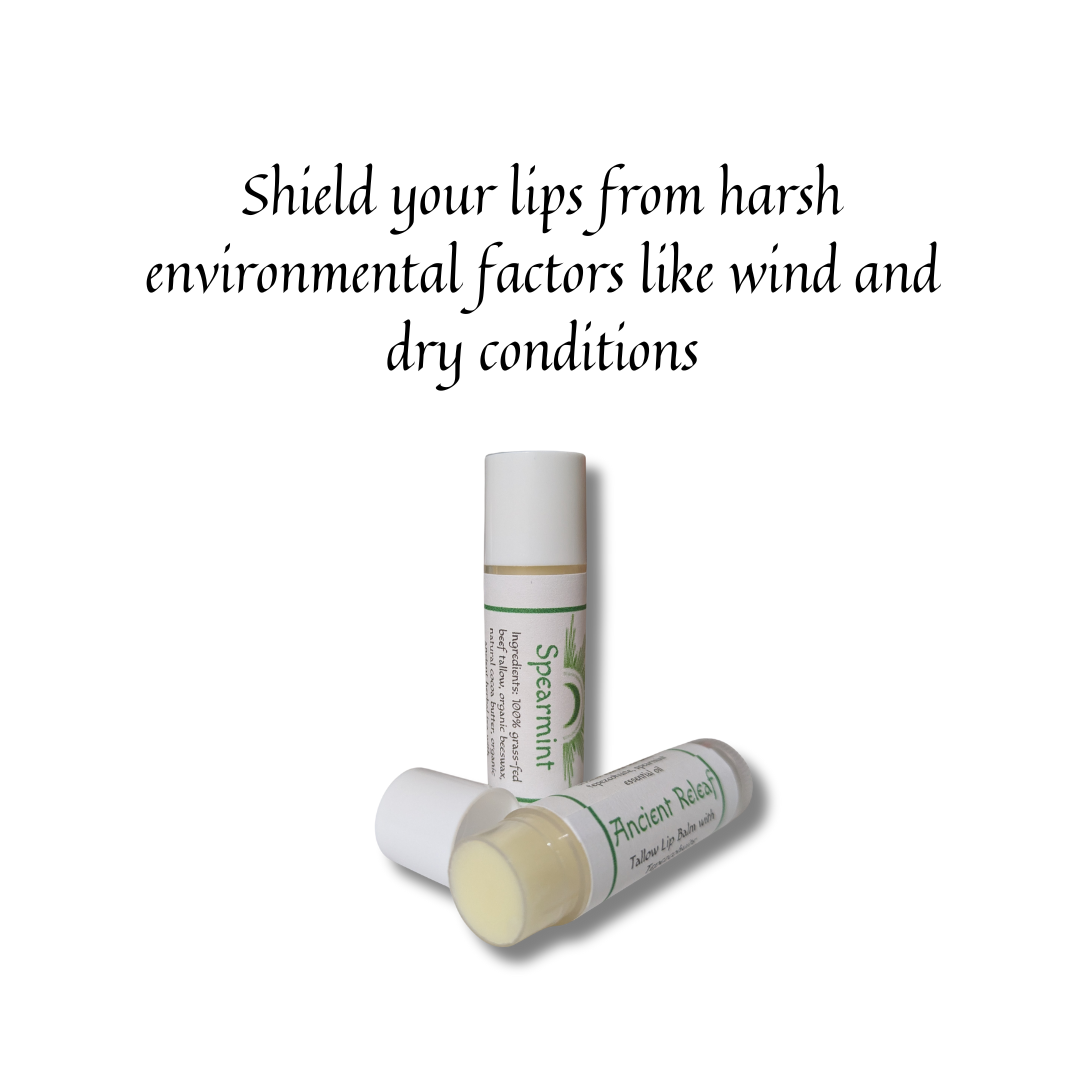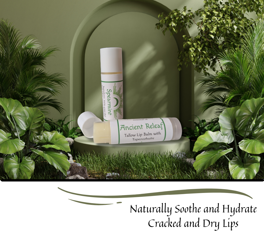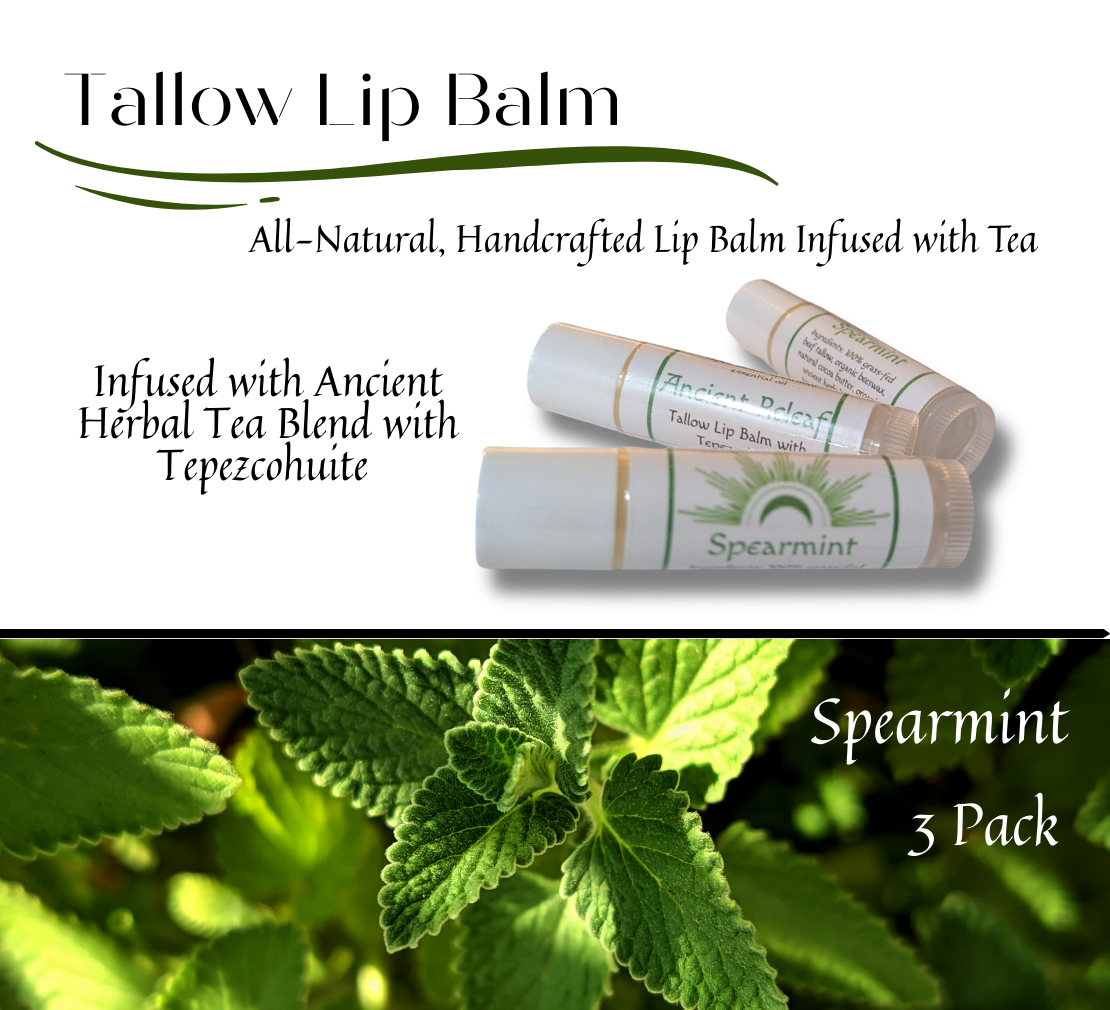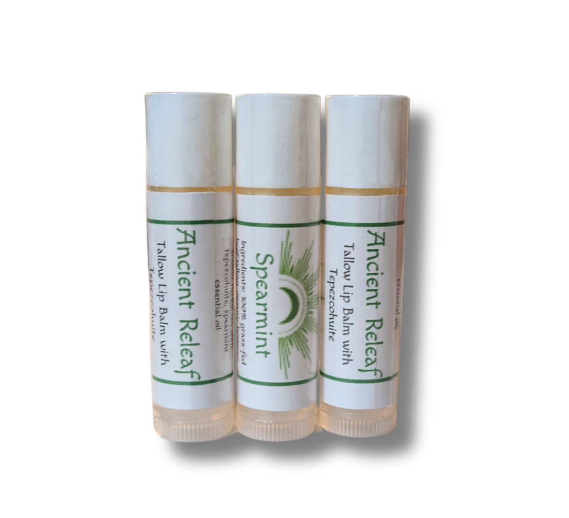 Ancient Releaf Tallow Lip Balm is enriched with a unique blend of ancient herbal teas, including Tepezcohuite. This soothing lip balm offers nourishing and soothing feel for cracked and chapped lips. Crafted from all-natural ingredients, using this lip balm can leave lips feeling soft, moisturized, and rejuvenated. ****The Spearmint 3 pack features three delightful lip balms.**** ****Spearmint Lip Balm Ingredients**** 100% Grass-fed beef Tallow, Natural Cocoa Butter, Organic Beeswax, 100% Pure Spearmint essential Oil.