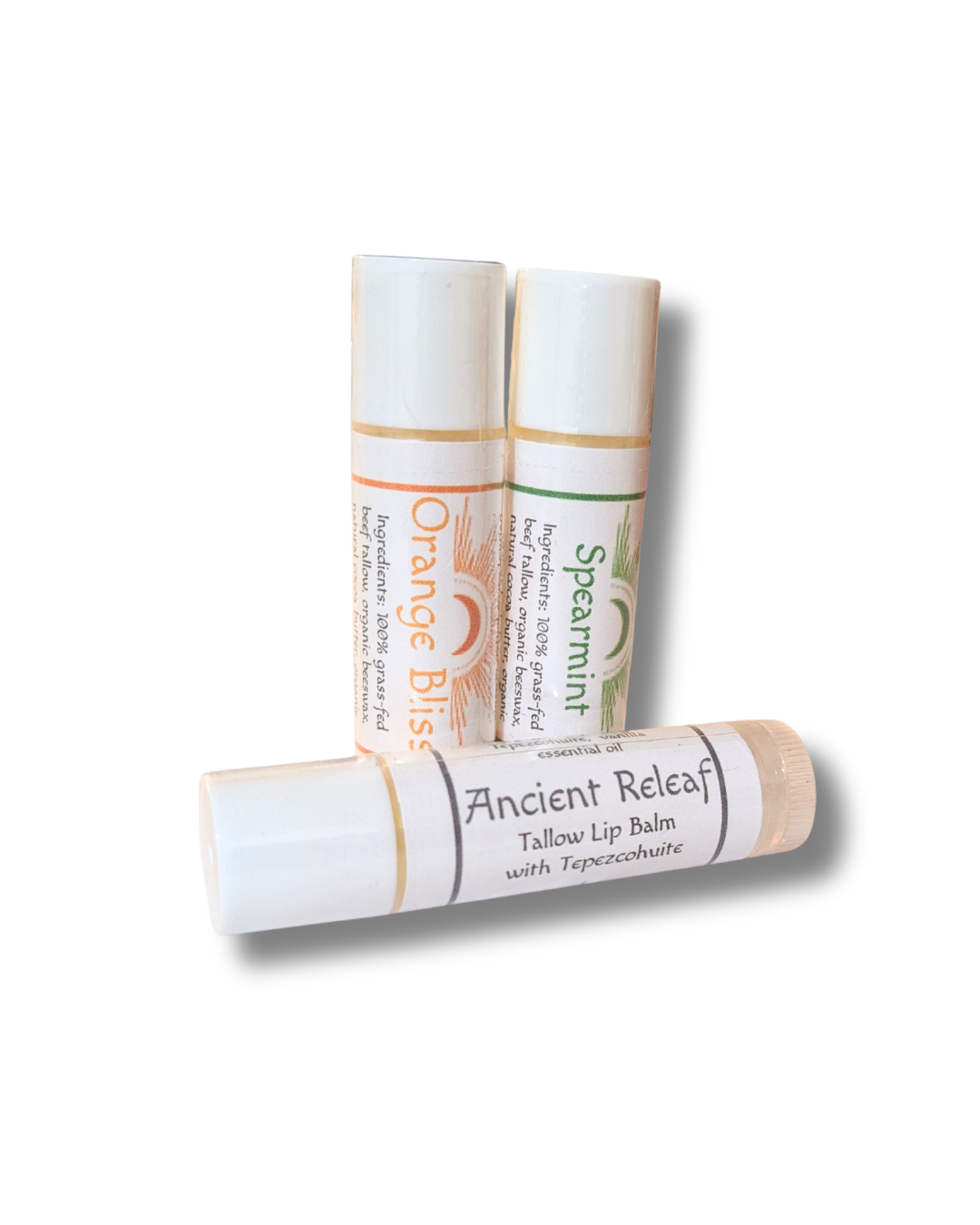 Ancient Releaf Tallow Lip Balm is enriched with a unique blend of ancient herbal teas, including Tepezcohuite. This soothing lip balm offers nourishing and soothing feel for cracked and chapped lips. Crafted from all-natural ingredients, using this lip balm can leave lips feeling soft, moisturized, and rejuvenated. ****The Variety Pack features three delightful lip balms: Vanilla, Spearmint, and Orange Bliss.**** ****Vanilla Lip Balm Ingredients**** 100% Grass-fed beef Tallow, Natural Cocoa Butter, Organic Beeswax, 100% Pure Vanilla essential Oil. ****Spearmint Lip Balm Ingredients****100% Grass-fed beef Tallow, Natural Cocoa Butter, Organic Beeswax, 100% Pure Spearmint essential Oil. ****Orange Bliss Lip Balm Ingredients****100% Grass-fed beef Tallow, Natural Cocoa Butter, Organic Beeswax, 100% Pure Orange, Vanilla, Clove essential Oil.