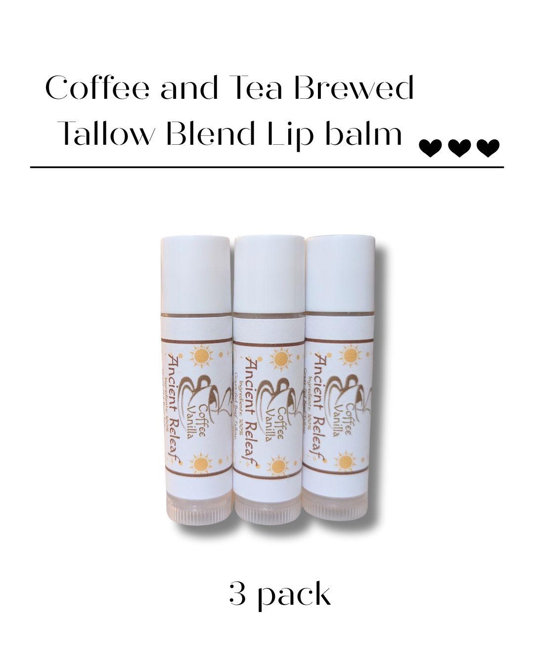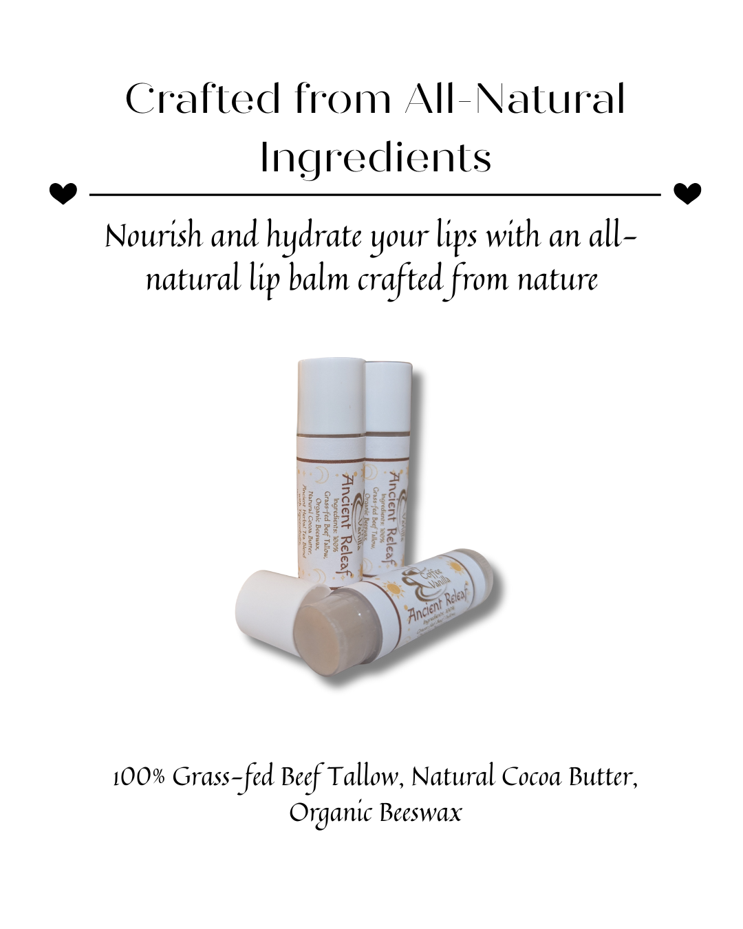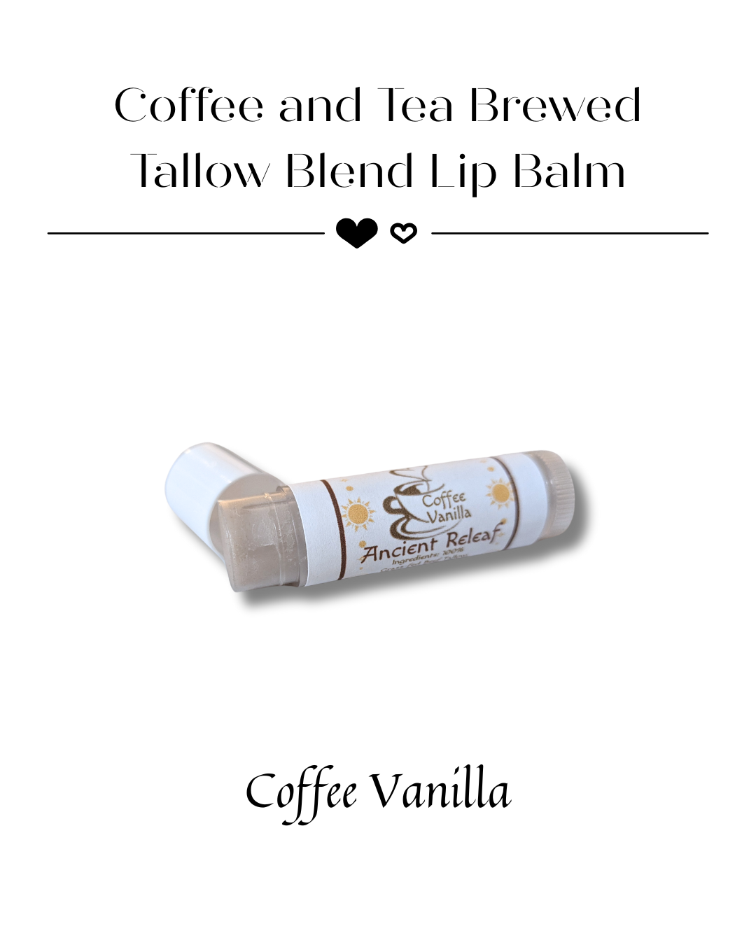Soothe dry, chapped lips with an all-natural lip balm crafted from a blend of natural oils; grass-fed beef tallow, organic beeswax, natural cocoa butter and infused with brewed coffee and tea, complemented by pure vanilla essential oil. This nourishing lip balm not only hydrates and protects your lips but also provides a delightful sensory experience with its enticing coffee-vanilla scent. The rich tallow blend forms a protective barrier against harsh environmental elements, ensuring lasting moisture. Additionally, the subtle aroma of coffee and vanilla lingers, adding warmth and comfort to your daily routine. Ideal for those who value natural skincare solutions, this lip balm is the perfect companion for maintaining soft, smooth lips throughout the seasons. ****Ingredients; 100% Grass-fed Beef Tallow, Organic Beeswax, Natural Cocoa Butter, Organic Witches Brew Dark Roast Coffee, Organic Ancient Herbal Tea Blend, 100% Pure Vanilla Essential Oil**** Made with all-natural Ingredients****