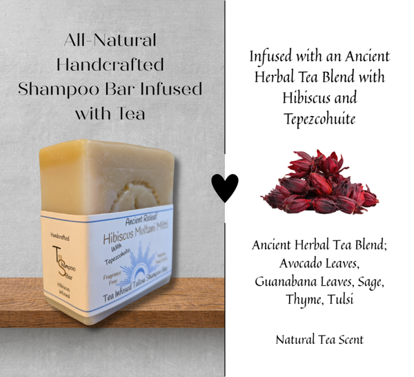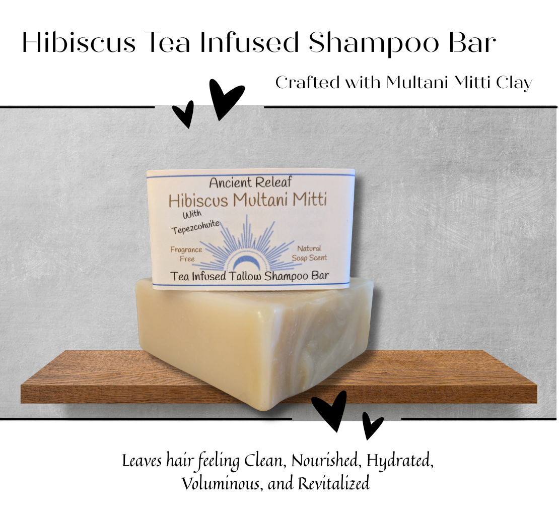 Doubled infused herbal tea Shampoo bar. Ancient Releaf infuses ancient herbal tea; avocado leaves, avocado seed, guanabana leaves, sage, thyme, tulsi (holy basil) and Tepezcohuite into the tea and oils. This shampoo bar was designed to cleanse, absorb oils, balance and moisturize naturally. Fragrance-free soap bar, natural soap scent. 5oz. shampoo bar. Ingredients: Saponified oils; 100% Grass-fed beef tallow, organic virgin coconut oil, 100% pure avocado oil, natural castor oil, organic shea butter, ancient herbal tea, Tepezcohuite, multani mitti clay